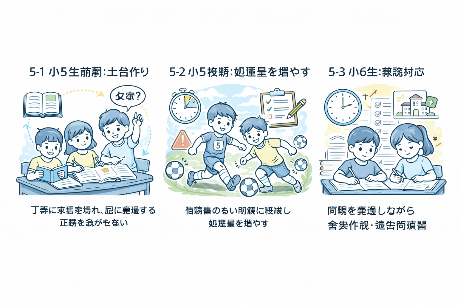 適性検査対策は、 短期間の詰め込みが効きません。 理由は明確です。 情報整理 判断の積み重ね 書き続ける集中力 これらは、筋トレのように 時間をかけてしか育たない力だからです。 小6から過去問演習を始めても、 処理スピードや持久力が追いつかないケースは少なくありません。小6の夏休みからサッカーに取り組む選手と、小5の4月からサッカーに取り組んできた生徒とでは、圧倒的に情報処理能力の差が生まれます。